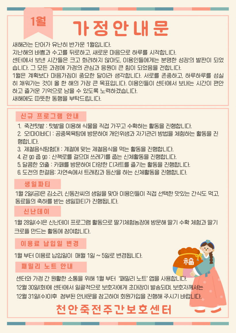 2026년 1월 가정안내문 페이지 정보 작성자 김미리 작성일26-01-05 14:44 조회554회 댓글0건 이전글 다음글 목록 본문 2026년 1월 가정안내문 입니다. 댓글목록 등록된 댓글이 없습니다. 이전글 다음글 목록