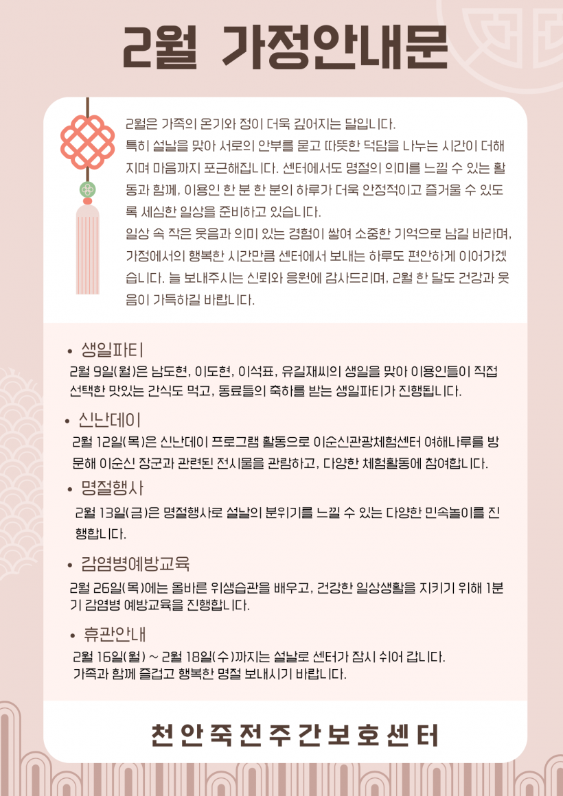 2026년 2월 가정안내문 페이지 정보 작성자 김미리 작성일26-01-29 16:17 조회269회 댓글0건 이전글 다음글 목록 본문 2월 가정안내문입니다. 댓글목록 등록된 댓글이 없습니다. 이전글 다음글 목록