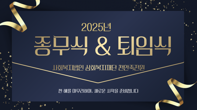 2025년 사회복지법인 삼화복지재단 천안죽전원 종무식 & 퇴임식 페이지 정보 작성자 운영자 작성일25-12-31 13:33 조회414회 댓글0건 관련링크 목록 본문 2025년 사회복지법인 삼화복지재단 천안죽전원 종무식 & 퇴임식을 진행하였습니다.항상 천안죽전원 가족분들의 얼굴에 웃음꽃이 활짝 피실 수 있는 죽전원이 되겠습니다!다가오는 2026년 새해 복 많이 받으세요!감사합니다. 댓글목록 등록된 댓글이 없습니다. 목록