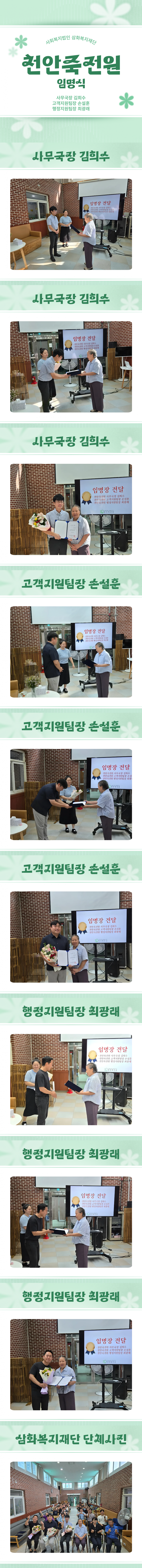 [9월] 사무국장 · 팀장 임명식 페이지 정보 작성자 운영자 작성일25-10-15 17:08 조회73회 댓글0건 관련링크 목록 본문 2025년 09월 01일(월) 김희수 사무국장님, 손설훈 고객지원팀장님, 최광래 행정지원팀장님 임명식을 진행하였습니다.천안죽전원 직원분들과 가족분들께서 뜨거운 박수와 힘찬 응원을 해주셨습니다. 댓글목록 등록된 댓글이 없습니다. 목록
