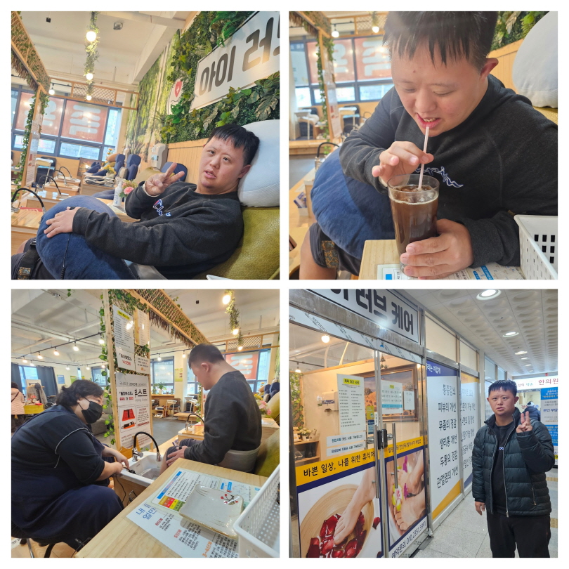 카페에 도착해 족욕통에 발을 담그는 순간, 따끈한 온기가 발끝부터 퍼지며 자연스럽게 표정도 한결 편안해졌고, 사진으로 표현된 메뉴판을 보고 김** 이용인이 직접 원하는 음료를 고르는 과정도 작은 즐거움이 되었습니다.