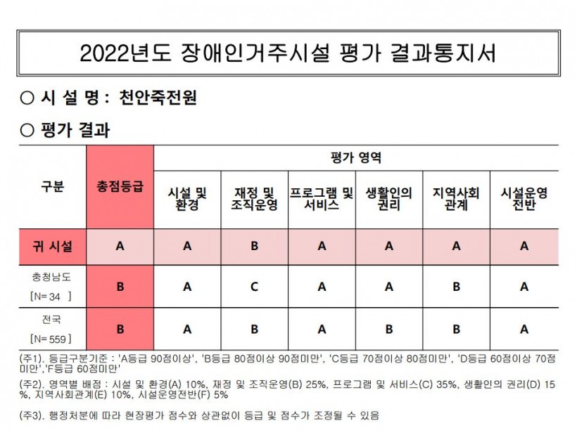 천안죽전원이 최우수 등급 A를 받았습니다.