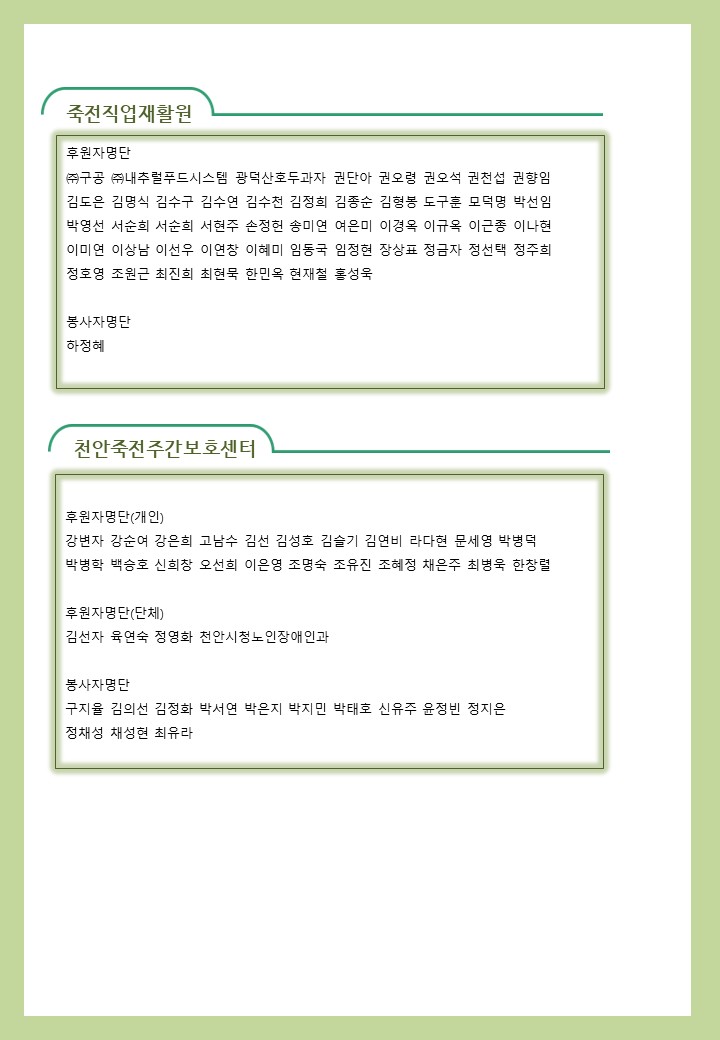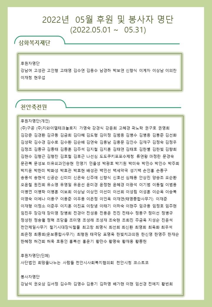 2022년 05월 사회복지법인 삼화복지재단 및 산하시설 후원금 수입·세출내역 및 후원자 명단 공고 페이지 정보 작성자 운영자 작성일22-06-03 20:30 조회4,771회 댓글0건 이전글 다음글 목록 본문 2022년 05월 사회복지법인 삼화복지재단 및 산하시설 후원금 수입·세출내역 및 후원자 명단 공고 2022년 05월 후원해 주신 모든 분들께 감사와 사랑을 전합니다. 댓글목록 등록된 댓글이 없습니다. 이전글 다음글 목록