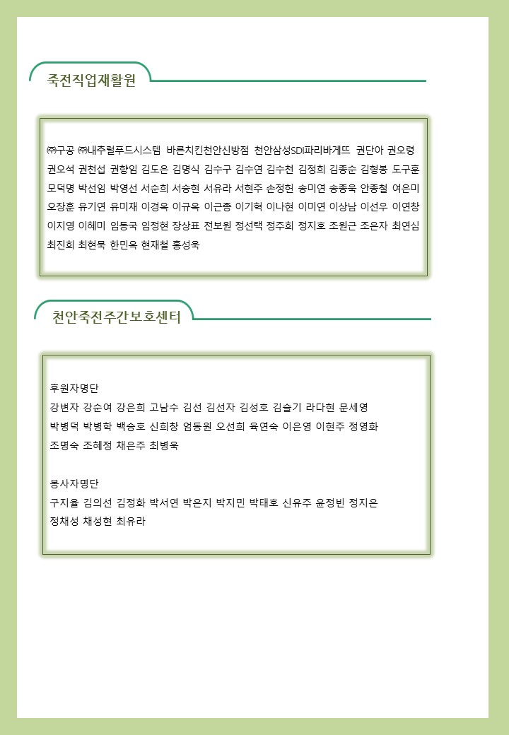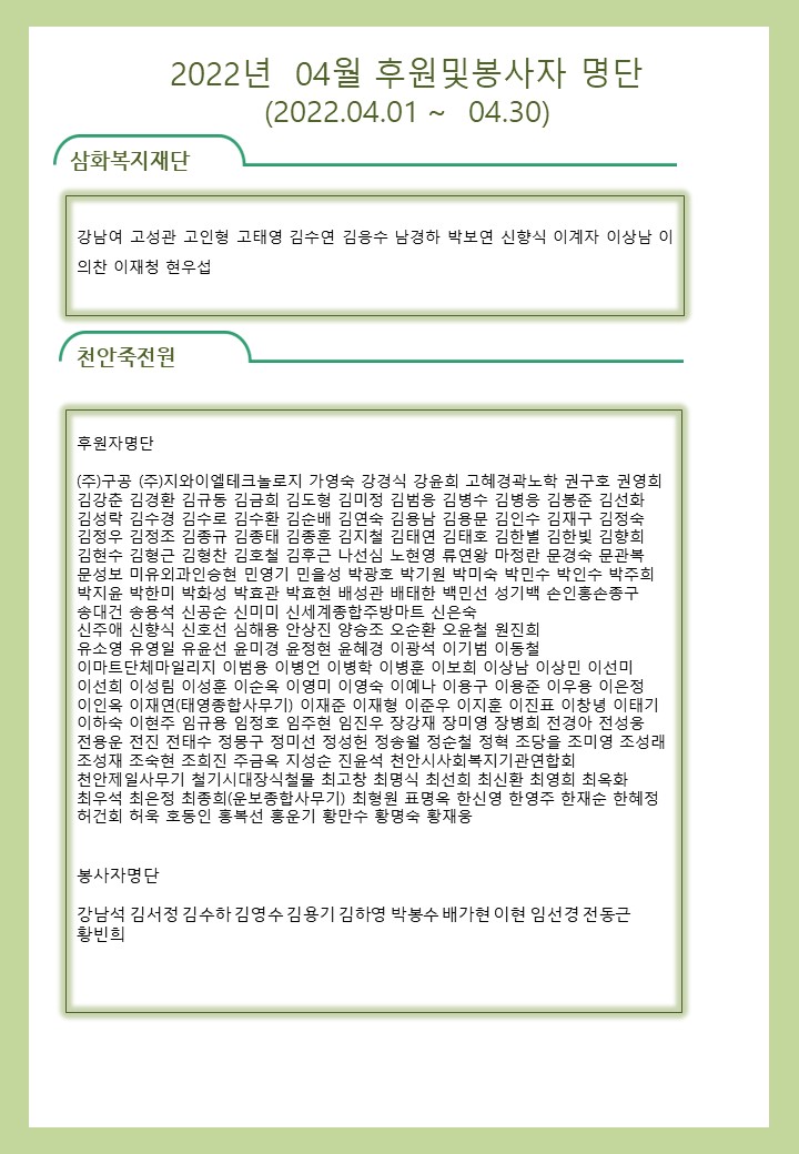 2022년 04월 사회복지법인 삼화복지재단 및 산하시설 후원금 수입·세출내역 및 후원자 명단 공고 페이지 정보 작성자 운영자 작성일22-05-11 09:30 조회4,727회 댓글0건 이전글 다음글 목록 본문 2022년 04월 사회복지법인 삼화복지재단 및 산하시설 후원금 수입·세출내역 및 후원자 명단 공고 2022년 04월 후원해 주신 모든 분들께 감사와 사랑을 전합니다. 댓글목록 등록된 댓글이 없습니다. 이전글 다음글 목록
