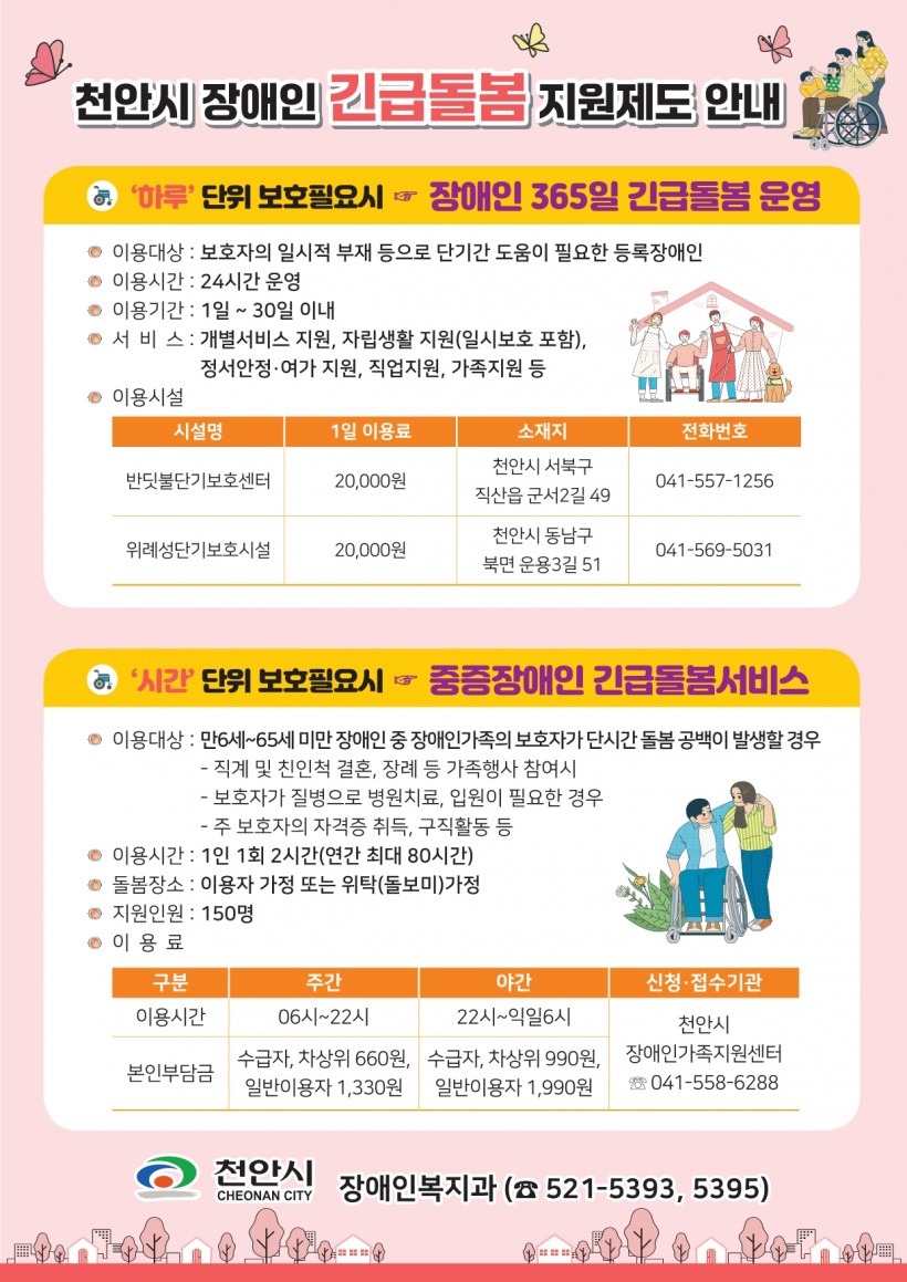 천안시는 장애인 보호자의 부재등으로 단기간 돌봄이 필요한 경우 지원하는 '장애인 365일 긴급돌봄 사업'을 추진하고 있습니다.