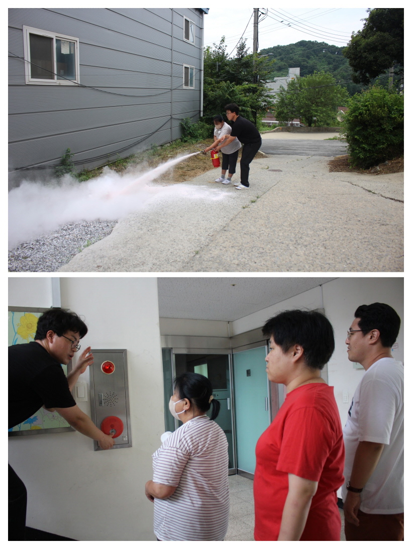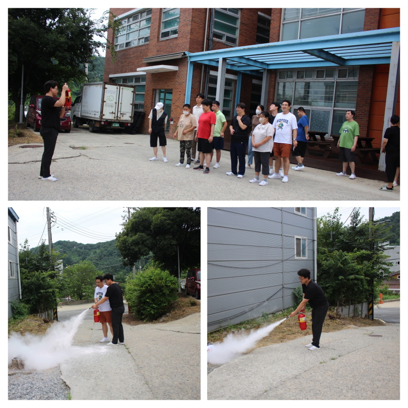 먼저 이론 교육에서는 화재 시 안전하게 대피하는 방법, 소화기 사용법, 심폐소생술 하는 방법을 배워보는 시간을 가져보았고, 소방대피훈련을 통해 실제 화재 시와 같이 대피자세를 취하고 대피해야 하는 장소로 이동해보는 활동을 진행하였습니다. 또한 소화기 사용법을 인지하기 위해 직접 소화기를 사용해보는 시간을 가져보았는데 교사의 지원을 받아 바람을 등지고 안전하게 소화기를 사용해 보았고, 화재 시 발신기 사용법에 대한 교육도 진행하였습니다.