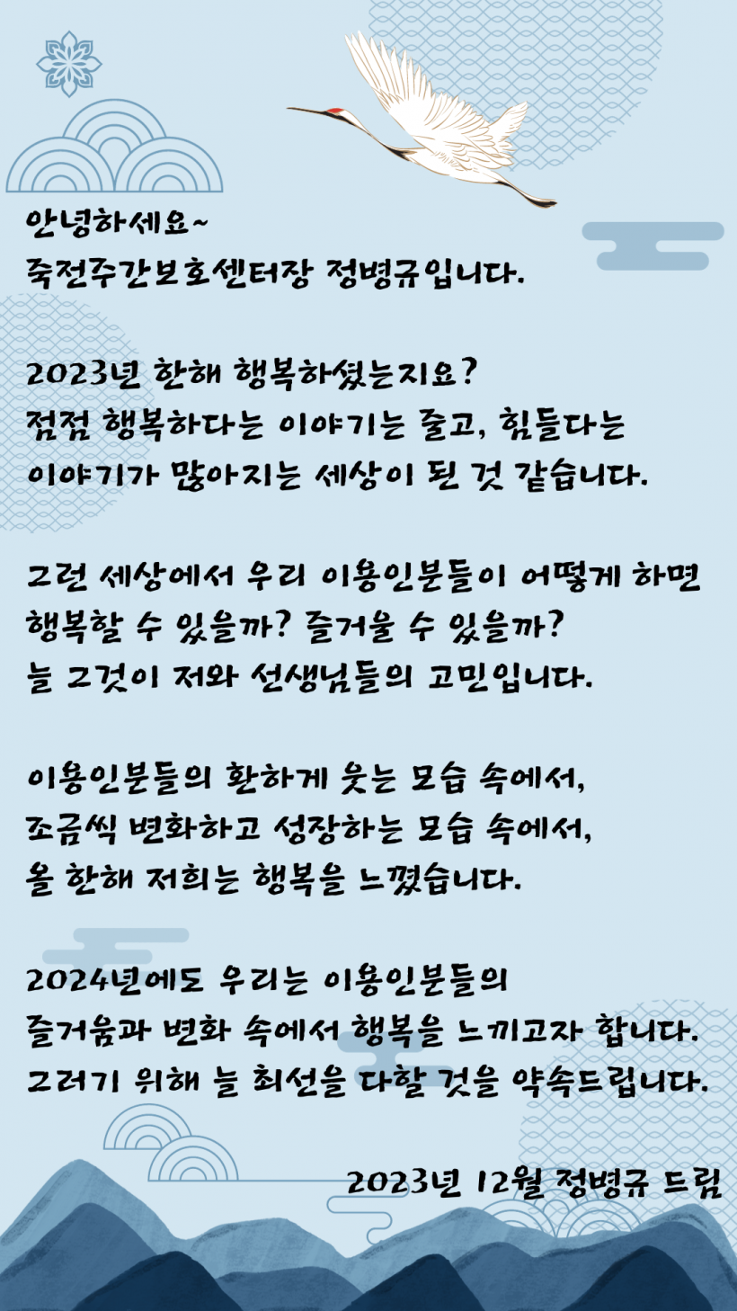2023년 송년인사 페이지 정보 작성자 김미리 작성일23-12-28 15:41 조회2,602회 댓글0건 이전글 다음글 목록 본문 2023년 한해동안 저희 센터와 함께 해주신 모든 분들께 감사 인사드립니다. 댓글목록 등록된 댓글이 없습니다. 이전글 다음글 목록