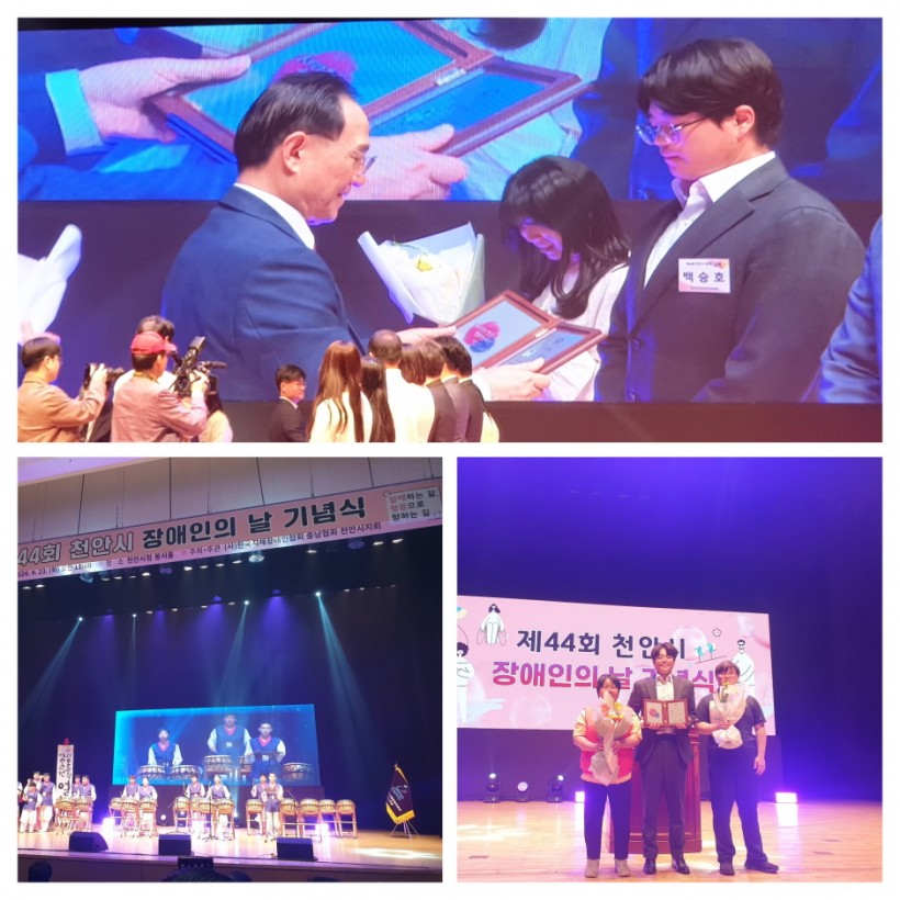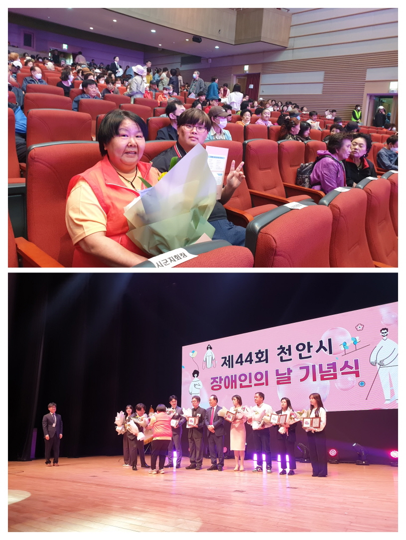 저희 센터에서는 제44회 장애인의 날을 맞아 진행되는 천안시 장애인의 날 기념식에 참석하여 축하공연을 관람하고, 장애인복지기여자 시장표창패 수여식에도 참여하였습니다.