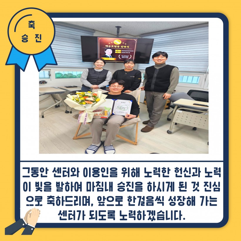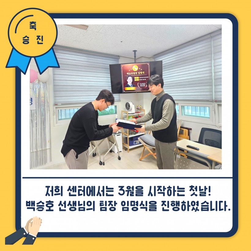 2025년 팀장 임명식 진행 페이지 정보 작성자 김미리 작성일25-03-05 09:14 조회1,525회 댓글0건 이전글 다음글 목록 본문 저희 센터에서 진행한 팀장 임명식을 소개합니다. 댓글목록 등록된 댓글이 없습니다. 이전글 다음글 목록