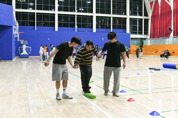이용인분들과 대학생들이 함께 땀 흘리며 즐겁게 운동하는 모습이 잘 담긴 기사입니다.