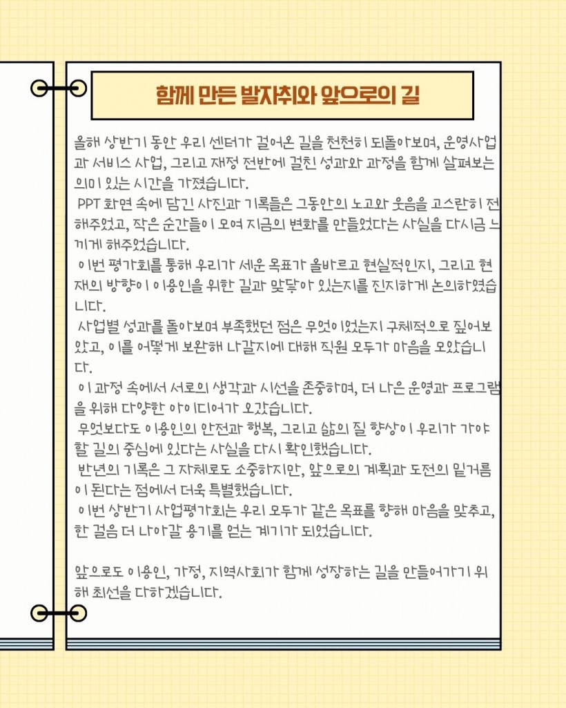 2025년 상반기 사업평가회, 함께 만든 발자취와 앞으로의 길 페이지 정보 작성자 김미리 작성일25-08-08 16:47 조회535회 댓글0건 이전글 다음글 목록 본문 저희 센터에서 진행된 2025년 상반기 사업평가회를 소개합니다. 댓글목록 등록된 댓글이 없습니다. 이전글 다음글 목록