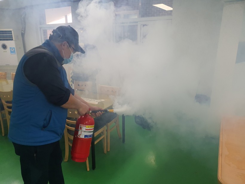 무각본으로 화재진압 및 대피훈련을 실시 후 소화기 사용법에 대해 알아보는 시간이었습니다.