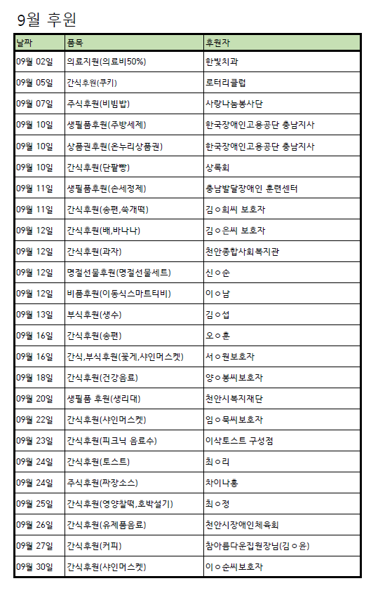 [후원] 9월 후원품 페이지 정보 작성자 운영자 작성일24-10-02 11:30 조회679회 댓글0건 관련링크 목록 본문 9월 후원해주신 모든 후원자님께 다시 한번 감사드립니다~! 댓글목록 등록된 댓글이 없습니다. 목록