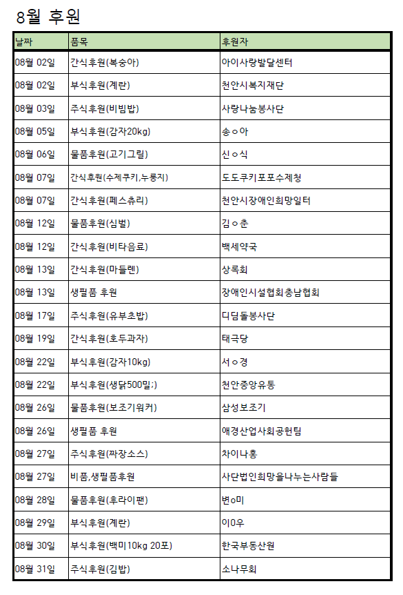 [후원] 8월 후원품 페이지 정보 작성자 운영자 작성일24-09-02 19:40 조회761회 댓글0건 관련링크 목록 본문 8월 후원해주신 모든 후원자님께 다시 한번 감사드립니다~! 댓글목록 등록된 댓글이 없습니다. 목록