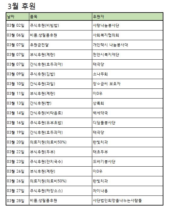 [후원] 3월 후원품 페이지 정보 작성자 운영자 작성일24-04-01 17:15 조회716회 댓글0건 관련링크 목록 본문 3월 후원해주신 모든 후원자님께 다시 한번 감사드립니다~! 댓글목록 등록된 댓글이 없습니다. 목록