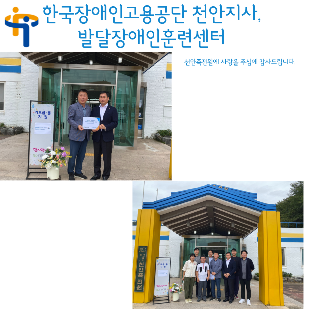[후원]한국장애인고용공단 천안지사,발달장애인훈련센터 페이지 정보 작성자 운영자 작성일23-09-25 17:27 조회563회 댓글0건 관련링크 목록 본문 23.09.25(월)한국장애인고용공단 천안지사,발달장애인훈련센터에서 후원 방문을 해주셨습니다.다시한번 감사드립니다~! 댓글목록 등록된 댓글이 없습니다. 목록