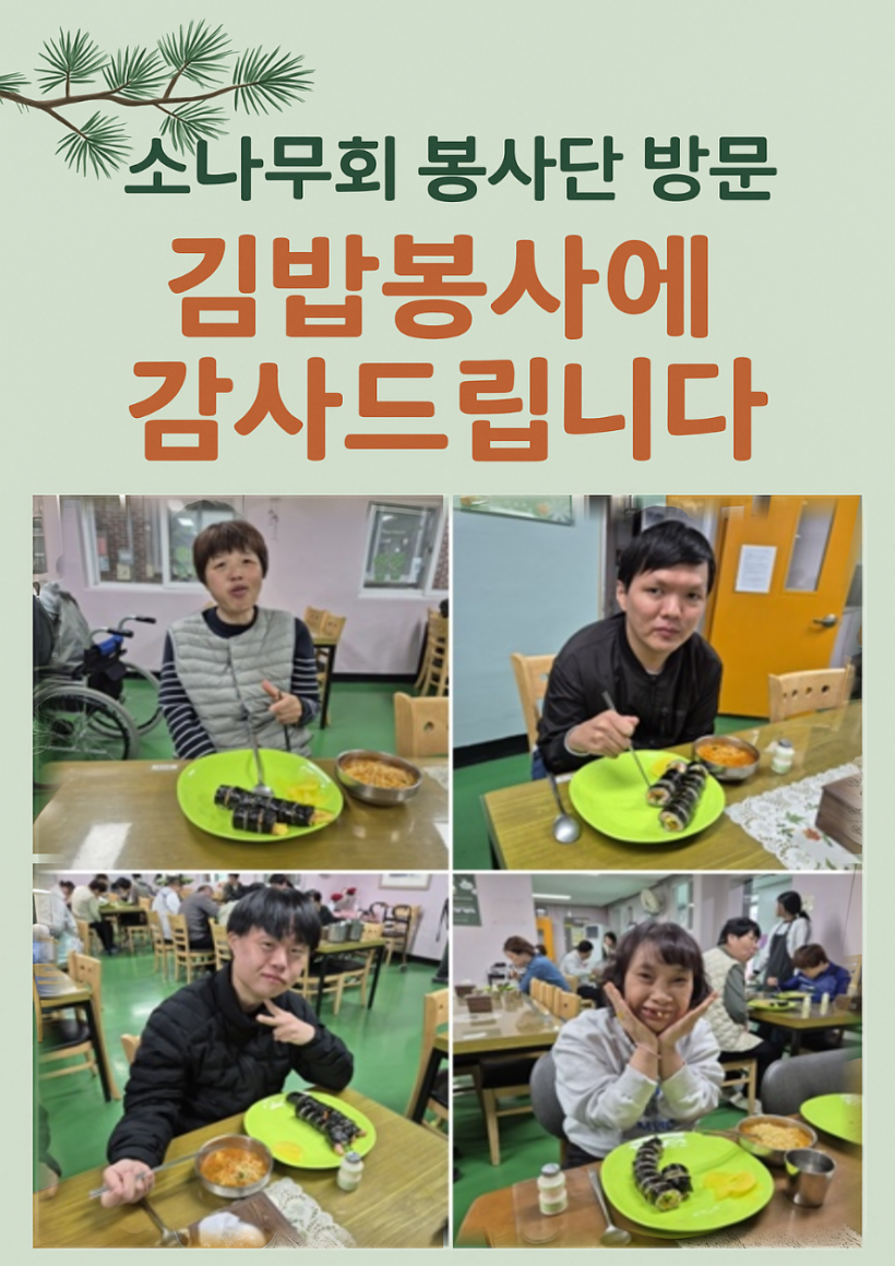 [자원봉사] 소나무회봉사단 페이지 정보 작성자 운영자 작성일25-04-22 11:06 조회383회 댓글0건 관련링크 목록 본문 25.04.13. 소나무회봉사단천안죽전원에 소나무회봉사단이 방문하셔 봉사활동을 진행해 주셨습니다.항상 감사드리고 맛있는 김밥 저희 가족분들이 남김없이 맛있게 드셔주셨습니다.감사합니다! 댓글목록 등록된 댓글이 없습니다. 목록