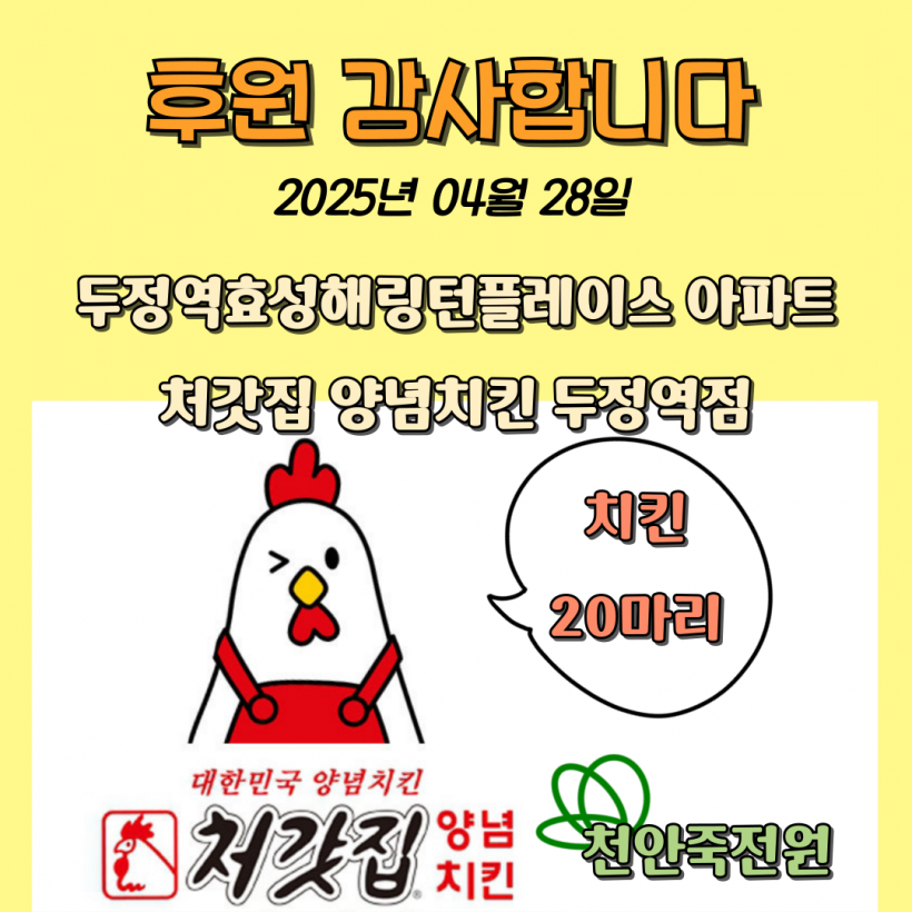 [후원] 치킨 후원 페이지 정보 작성자 운영자 작성일25-04-30 09:37 조회571회 댓글0건 관련링크 목록 본문 25.04.28.(월)두정역효성해링턴 플레이스 아파트 와 처갓집 양념치킨 두정역점에서 치킨 20마리 기부해주셨습니다.저희 가족분들이 정신없이 맛있게 식사해주셨습니다. 항상 감사합니다. 댓글목록 등록된 댓글이 없습니다. 목록