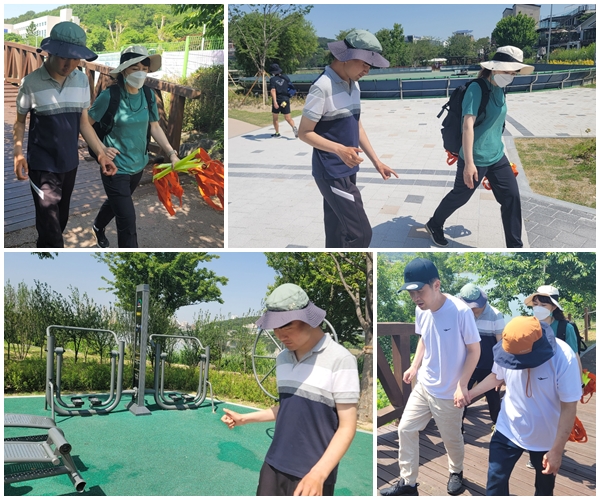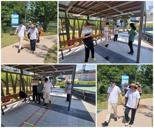 수업때 배운 내용으로 천호지 산책길을 걸어보고 발을 끌거나 팔자 걸음으로 걷기도 하시고 빠른 걸음으로