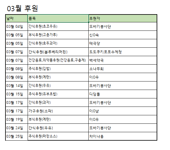 [후원] 3월 후원품 페이지 정보 작성자 운영자 작성일25-04-04 17:18 조회513회 댓글0건 관련링크 목록 본문 25년 03월 후원품 목록입니다.따뜻한 햇살이 내려오고 벚꽃이 만개하는 봄이 왔습니다.항상 다정한 마음으로 천안죽전원에 후원해주시는 모든 분들께 감사드립니다.일교차가 크니 항상 감기 조심하십시요. 댓글목록 등록된 댓글이 없습니다. 목록