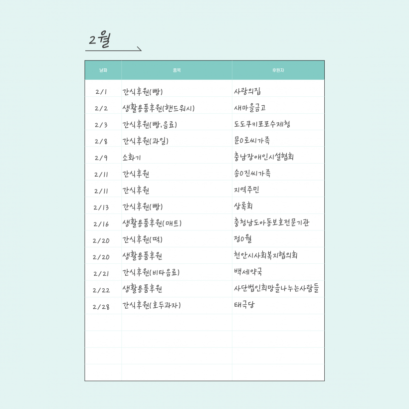 [후원] 2월 후원품 페이지 정보 작성자 운영자 작성일23-03-13 10:06 조회315회 댓글0건 관련링크 목록 본문 2월 후원해주신 모든 후원자님께 다시 한번 감사드립니다~! 댓글목록 등록된 댓글이 없습니다. 목록