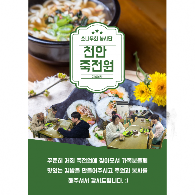 [자원봉사]소나무회봉사단 페이지 정보 작성자 운영자 작성일25-02-05 15:39 조회569회 댓글0건 관련링크 목록 본문 25.01.11 25년에도 다시 찾아와주셔서 죽전원 가족분들께 맛있는 김밥을 후원해주시고 봉사해주셨습니다.감사합니다! 댓글목록 등록된 댓글이 없습니다. 목록