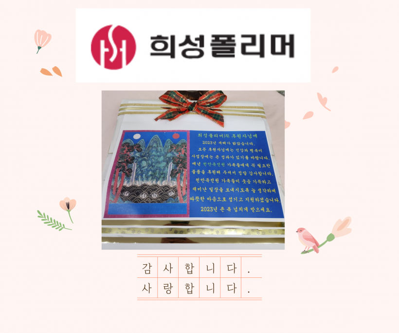 후원 감사 떡 전달 페이지 정보 작성자 운영자 작성일23-01-18 14:26 조회346회 댓글0건 관련링크 목록 본문 오랜시간 천안죽전원 가족들을 후원해 주시는 희성폴리머(주)에 가족들의 마음과 정성을 담아 떡을 전달하였습니다.항상 감사합니다! 풍성한 명절 보내세요! 댓글목록 등록된 댓글이 없습니다. 목록