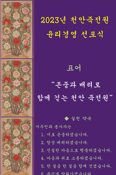 2023년 천안죽전원 윤리경영 선포식 페이지 정보 작성자 운영자 작성일23-01-04 18:05 조회438회 댓글0건 관련링크 목록 본문 2022.01.02(월)천안죽전원 윤리경영 선포식을 진행하였습니다.표어로"존중과 배려로 함께 걷는 천안 죽전원"을 선정하였습니다.표어에 맞게 천안죽전원 가족들을 위해 더욱더 노력하는 천안죽전원이 되도록 다짐을 하였습니다. 댓글목록 등록된 댓글이 없습니다. 목록