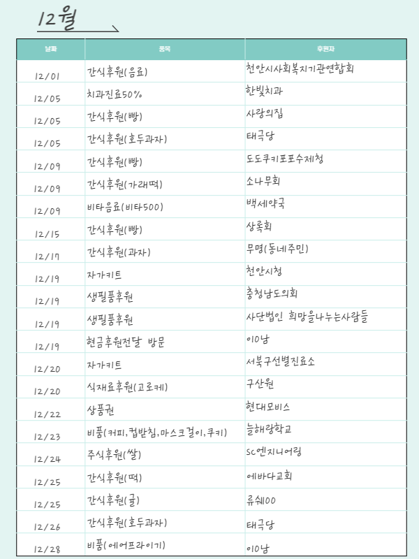 [후원]12월 후원품 페이지 정보 작성자 운영자 작성일22-12-30 12:18 조회342회 댓글0건 관련링크 목록 본문 12월 후원해주신 모든 후원자님께 다시 한번 감사드립니다~! 댓글목록 등록된 댓글이 없습니다. 목록