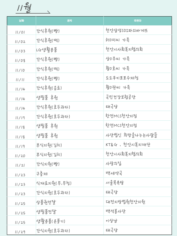 [후원]11월 후원품 페이지 정보 작성자 운영자 작성일22-12-09 20:23 조회299회 댓글0건 관련링크 목록 본문 11월 후원해주신 모든 후원자님께 다시 한번 감사드립니다~! 댓글목록 등록된 댓글이 없습니다. 목록