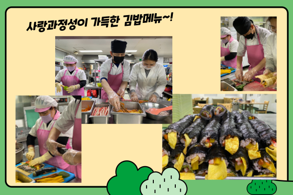 김밥 Day~ 페이지 정보 작성자 운영자 작성일22-10-14 18:16 조회311회 댓글0건 관련링크 목록 본문 2022.10.14(금)저녁식사 메뉴로 김밥이 나오는 날입니다가족들 모두 좋아하는 메뉴로 손이 많이 가는 메뉴지만가족들을 위해 정성과 사랑을 듬뿍 담아 맛있게 김밥을 만들어주셨습니다.맛있는 음식을 매일 만들어주시는 영양사 선생님과 주방 선생님들 감사합니다~~~ 댓글목록 등록된 댓글이 없습니다. 목록