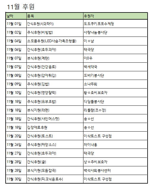 [후원] 11월 후원품 페이지 정보 작성자 운영자 작성일24-12-04 11:56 조회530회 댓글0건 관련링크 목록 본문 11월 후원해주신 모든 후원자님께 다시 한번 감사드립니다~! 댓글목록 등록된 댓글이 없습니다. 목록