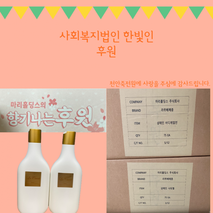 [후원] 사회복지법인 한빛인 페이지 정보 작성자 운영자 작성일21-12-23 18:02 조회341회 댓글0건 관련링크 목록 본문 2021.12.23(목)사회복지법인 한빛인에서 바디용품을 후원해주셨습니다~향가가득한 나눔 감사합니다 :) 댓글목록 등록된 댓글이 없습니다. 목록