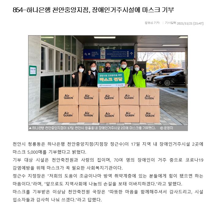 [후원]청룡동복지센터, 하나은행 페이지 정보 작성자 운영자 작성일21-11-17 11:34 조회345회 댓글0건 관련링크 목록 본문 2021.11.17.(수)청룡동복지센터와 하나은행에서 마스크 후원을 해주셨습니다.항상 감사드립니다 :) 댓글목록 등록된 댓글이 없습니다. 목록
