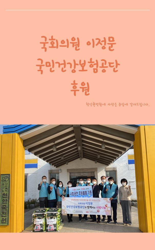 [후원]국회의원 이정문, 국민건강보험공단 페이지 정보 작성자 운영자 작성일21-11-18 17:15 조회320회 댓글0건 관련링크 목록 본문 2021.11.18.(목)국회의원 이정문, 국민건강보험공단에서 천안죽전원을 방문해 주셨습니다.후원 감사드립니다. 댓글목록 등록된 댓글이 없습니다. 목록