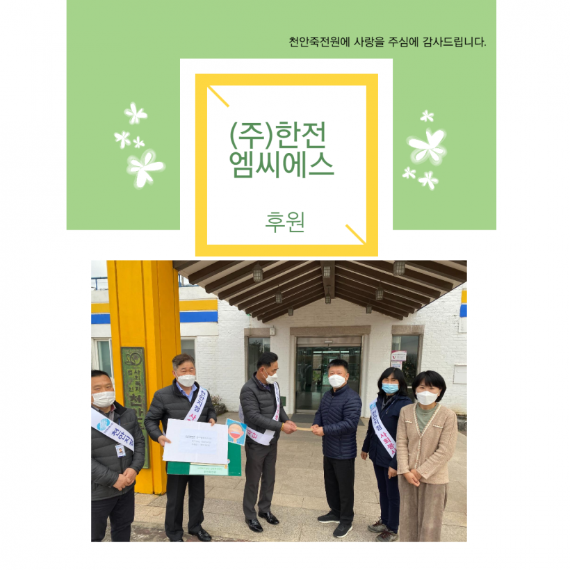 [후원] (주)한전엠씨에스 천안지사 페이지 정보 작성자 운영자 작성일21-11-29 15:06 조회338회 댓글0건 관련링크 목록 본문 21.11.29(월)한전엠씨에스에서 후원금 전달로 죽전원에 방문해주셨습니다.감사합니다 :) 댓글목록 등록된 댓글이 없습니다. 목록