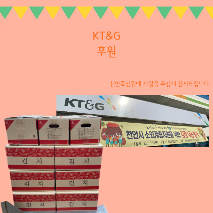 [후원] KT&G 페이지 정보 작성자 운영자 작성일21-12-02 17:29 조회330회 댓글0건 관련링크 목록 본문 2021.12.02.(목) KT&G 천안공장과 천안시복지재단에서김치후원을 해주셨습니다.감사합니다 :) 댓글목록 등록된 댓글이 없습니다. 목록