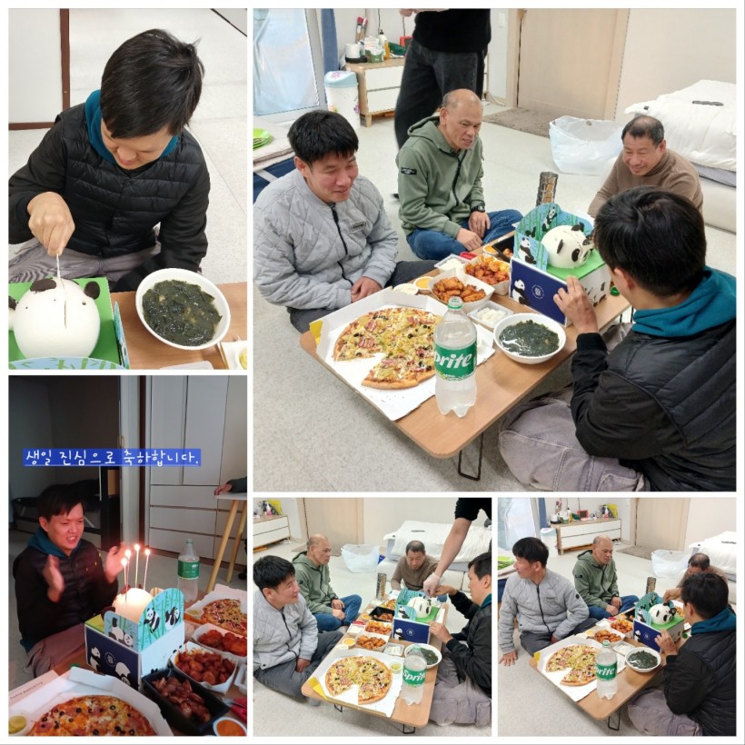 함께 생활하는 가족들과 함께 생일축하 노래도 부르고 커팅식도 하고 준비한 맛있는 치킨과 피자도 함께 나누면서 즐거운 시간을 가졌습니다. 미역국을 맛있게 끓여주신 주방 선생님 감사합니다.