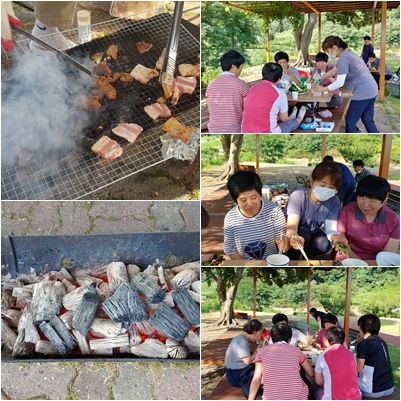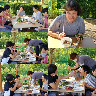 날씨가 너무 더워서 불을 이용한 고기굽기가 가능할까 걱정을 했는데, 다행히 그늘에서 바람도 불어주고 해서 진행할 수 있었습니다. 더운 날씨에 고기굽느라 고생해주신 원장님, 신**선생님 덕분에 가족들이 즐겁게 참여할 수 있었습니다. 상추는 윤** 선생님이 죽전원 한켠에서 열심히 가꾼 것을 뜯어서 사용하도록 지원해 주셨고, 담임교사 **숙 선생님이 집에서 한가득 가져와서 푸짐하게 먹을 수 있었다.
