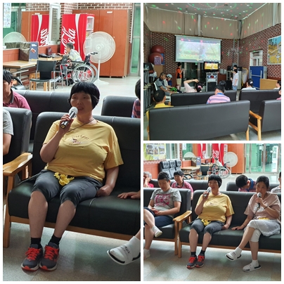2021년 7월 3일 오후 1시 30분 ~ 3시까지 신바람 노래방을 진행하였습니다. 참여하시 모든 거주인들이 즐겁고 행복하게 일주일간을 스트레스를 풀면서 즐거운 시간을 만들었습니다.