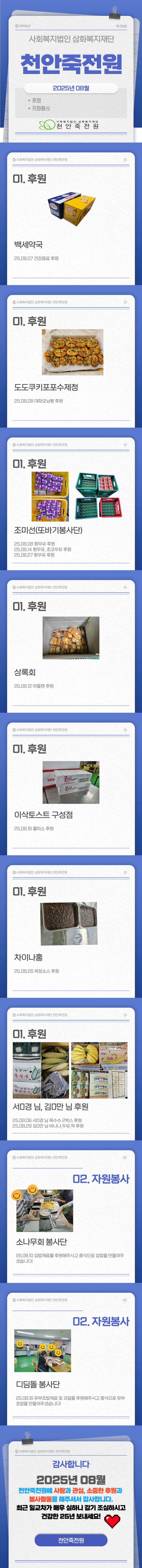 [8월] 후원 자원봉사 페이지 정보 작성자 운영자 작성일25-09-03 11:18 조회292회 댓글0건 관련링크 목록 본문 2025년 08월 한달동안 천안죽전원에 사랑과 나눔을 전달해주신 분들을 소개합니다!꾸준히 저희 천안죽전원에 관심을 가져주시고 사랑을 나눠주시는 이웃주민과 지역사회 주민분들이 계셔행복합니다 감사합니다! 댓글목록 등록된 댓글이 없습니다. 목록
