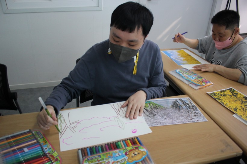 이용인분들과 함께 봄을 맞이하여 꽃, 나무들을 그려보았습니다.