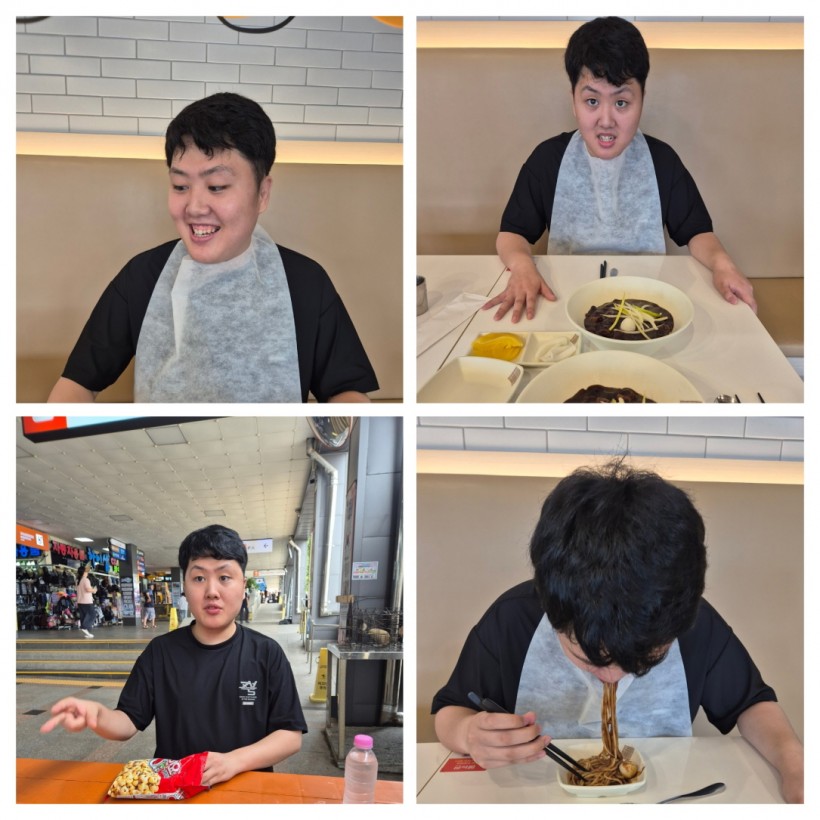 가장 기대했던 자장면을 먹는 식사 시간에는 음식을 먹으며 밝은 표정으로 맛있게 먹는 모습이 인상적이었고, 휴게소에서 기념품 구경과 산책도 하며 즐거운 시간을 보냈습니다.