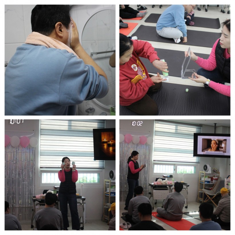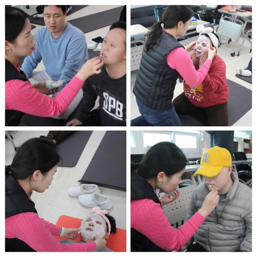 세안-스킨바르기-마스크팩하기-립밤 바르기 순서로 스킨케어 실습을 하였고, 스스로 케어하기 어려운 이용인은 교사의 지원을 받아 참여하였습니다. 저희 이용인분들이 가장 좋아한 스킨케어 방법은 마스크팩하기!!