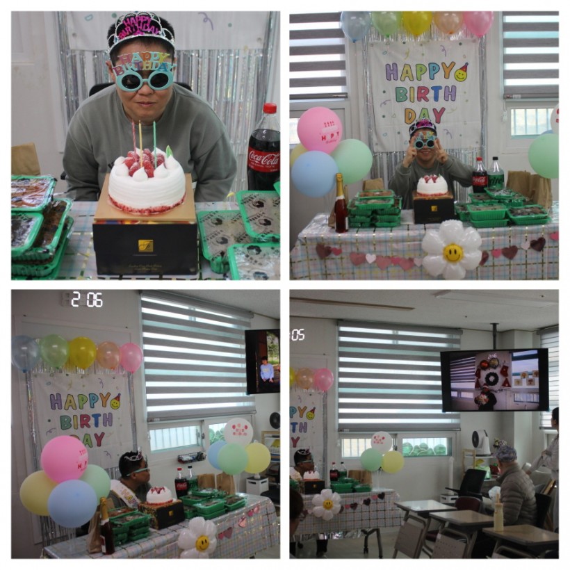 생일을 맞은 이용인을 위해 만든 축하 동영상도 보는 시간에는 TV화면에 자신의 모습이 나와서 인지 미소를 지으며 영상을 바라보는 모습을 보였고, 동료들이 생일 축하 노래를 부르니 같이 박수를 치며 노래를 부르는 모습을 보였습니다. 또한 케이크와 자치회의를 통해 결정된 생일파티 간식인 분식세트도 먹으며 환한 미소를 지으며 기뻐했고, 다른 이용자들도 함께 축하해 주며 따뜻한 분위기가 만들어졌습니다.