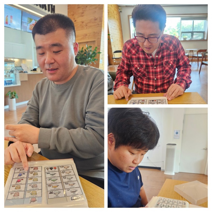 소그룹으로 활동을 진행하며, 카페 안에 앉아 음료 사진을 하나씩 살펴보며 마시고 싶은 음료를 직접 고릅니다.