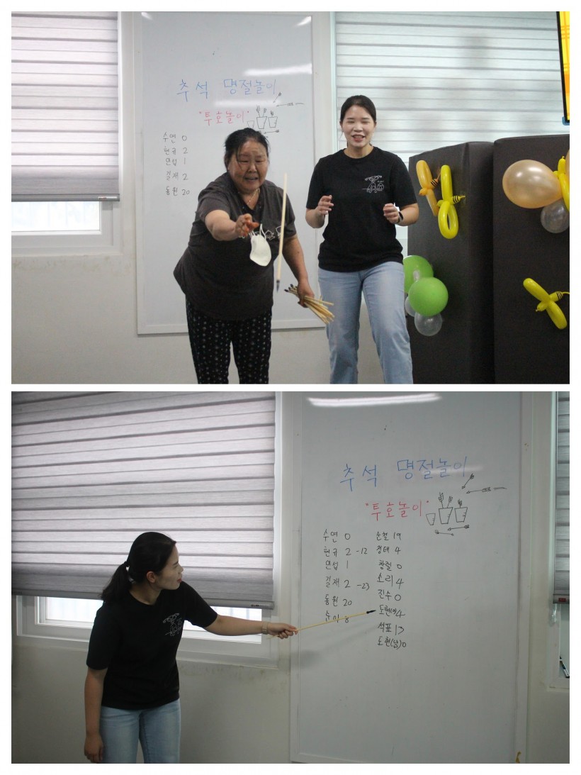 투호놀이 시간에는 3개의 크기가 다른 통에 투호 화살을 넣는 활동을 진행하였는데 통 크기 마다 점수를 달리해 진행하니 더욱 즐겁게 참여하는 모습을 보였고, 놀이를 진행한 후 시상식을 통해 추석선물을 전달하는 시간을 가져보았습니다.