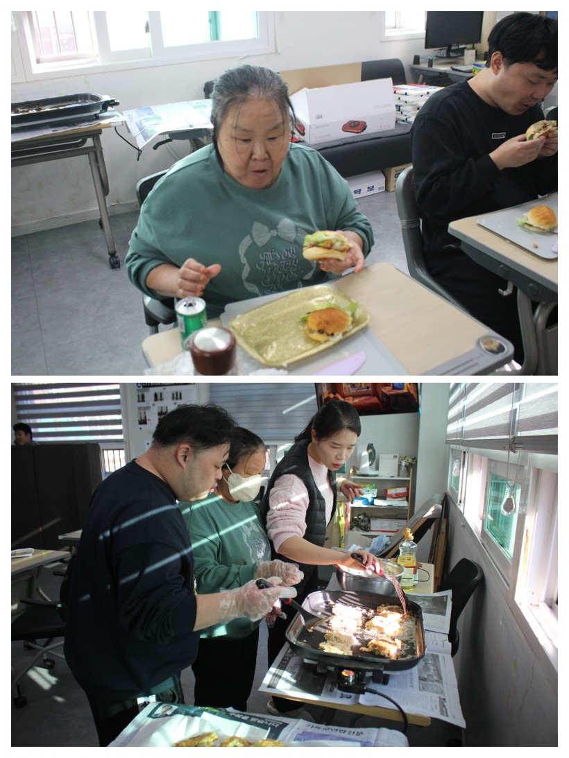 오후에는 구입한 재료인 참치, 파프리카, 양파 등을 이용해 버거의 패티를 만들어 전기팬에 직접 구워보기도 하고, 모닝빵 사이에 양상추와 오이, 소스, 참치로 만든 패티를 넣어 참치버거를 완성한 후 간식으로 맛있게 먹어보았습니다.