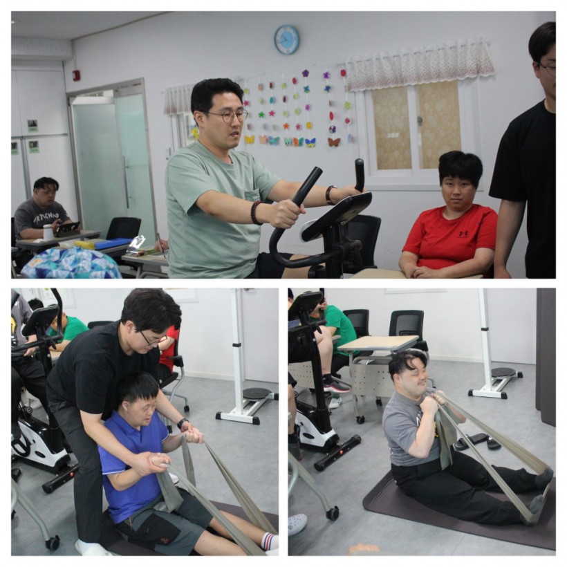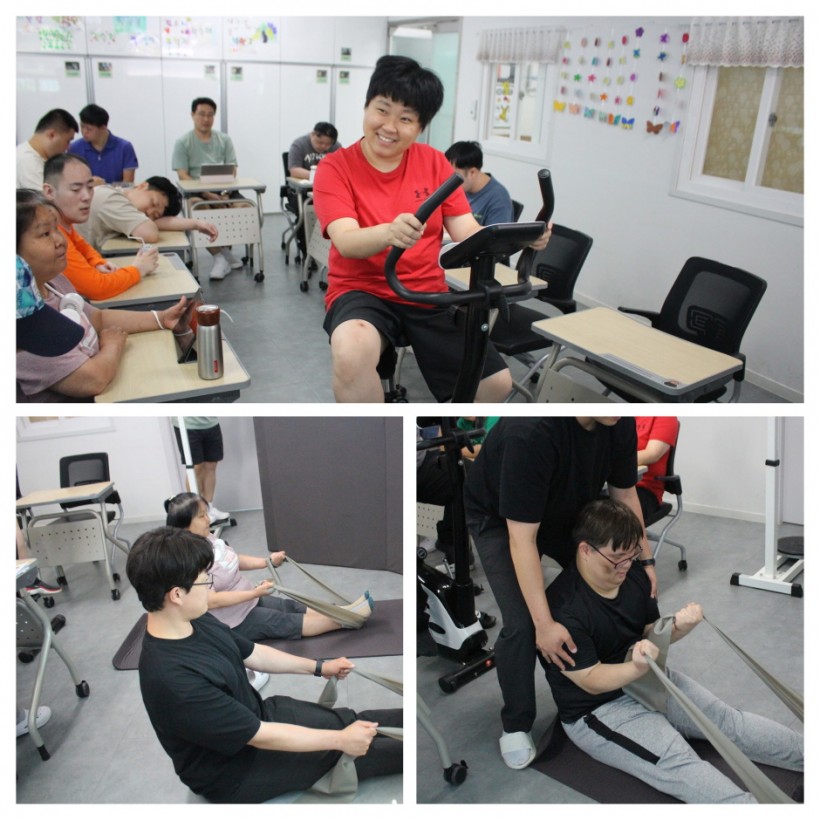 특별히 뉴스포츠를 함께 하는 백석대학교 특수체육학과에서 제작한 밴드운동 가이드데로 교사의 지원을 받아 운동을 진행하니 이용인들이 어렵지 않게 밴드운동에 참여하였고, 소수의 이용인은 직접 운동 사진을 보고 동작을 따라하며 운동에 집중하고 운동 후에는 건강해진것 같다고 이야기를 하기도 하였습니다.