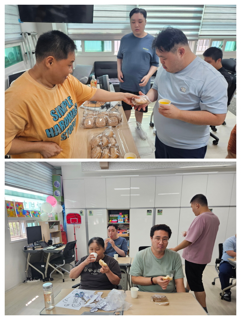 센터로 돌아온 후에는 간식 시간, 이*연 씨가 직접 고른 간식을 동료들에게 나누어주며 얼굴 가득 미소를 짓는 모습이 인상적이었습니다.
